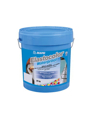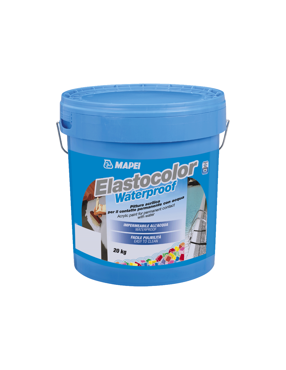 Pittura acrilica per il contatto permanente con acqua, impermeabile e di facile pulibilità, per esterni ed interni.