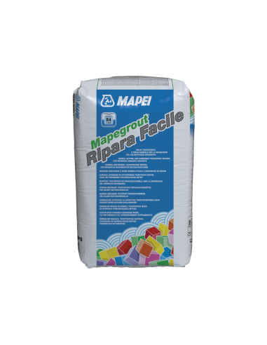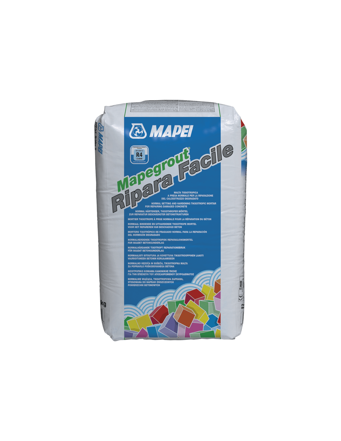 Rapporto dell’impasto: 100 parti di MAPEGROUT RIPARA FACILE con 16-17 parti di acqua (4,0-4,25 l di acqua per ogni sacco da 25 kg) e 0,25% di MAPECURE SRA. (1 flacone da 0,25 kg ogni 4 sacchi di MAPEGROUT RIPARA FACILE).