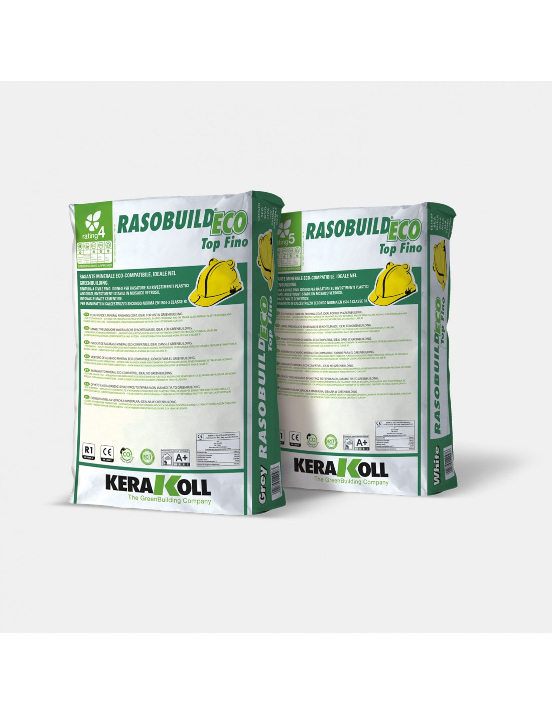 Rasobuild® Eco Top Fino è idoneo per rasature e livellamenti di superfici assorbenti ed inassorbenti, nella realizzazione di finiture ad alti livelli di stabilità dimensionale e superiori resistenze meccaniche. Idrofugato. Interni, esterni. Bianco e grigio.